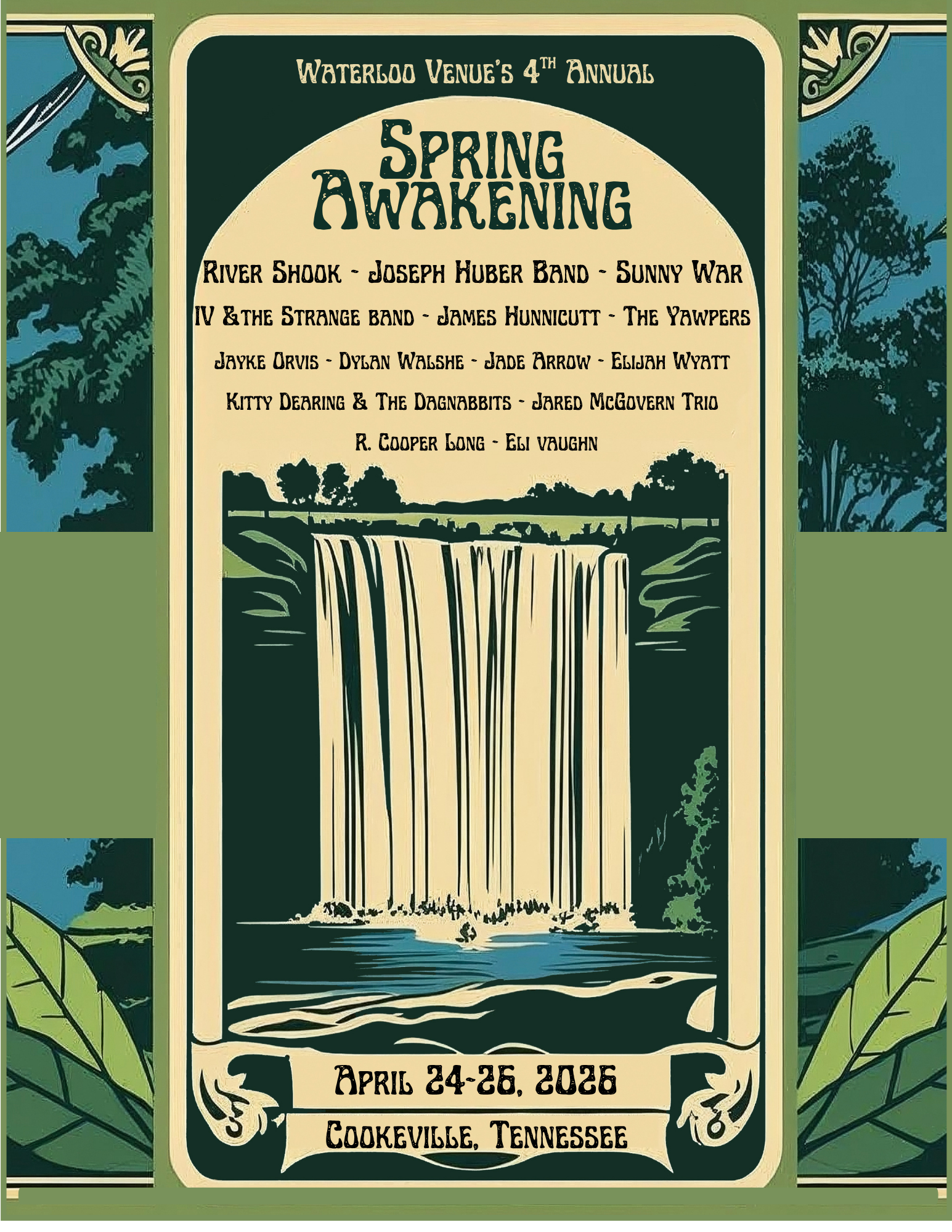 The ticket holder, in consideration of being permitted to access, use or attend an event on the property located at Waterloo Venue & Events, LLC, 145 Virgil Murphy Circle, Cookeville, Tennessee, and/or in addition to paying the venue to do so, as further consideration, hereby release and forever discharge Waterloo Venue & Events, LLC and it’s officers, employees, agents of alcoholic beverages, successors and assigns, jointly and severally, from any and all actions, causes of actions, claims and for upon or by reason of any damage, loss, injury, or death, which hereafter may be sustained by accessing, using or attending an event on the property of Waterloo Venue & Events, LLC located at 145 Virgil Murphy Circle, Cookeville, Tennessee. This release extends and applies to and also covers and includes, all unknown, unanticipated and unsuspected injuries, damages, loss and liability, and the consequences thereof, as well as those now disclosed and known to exist.